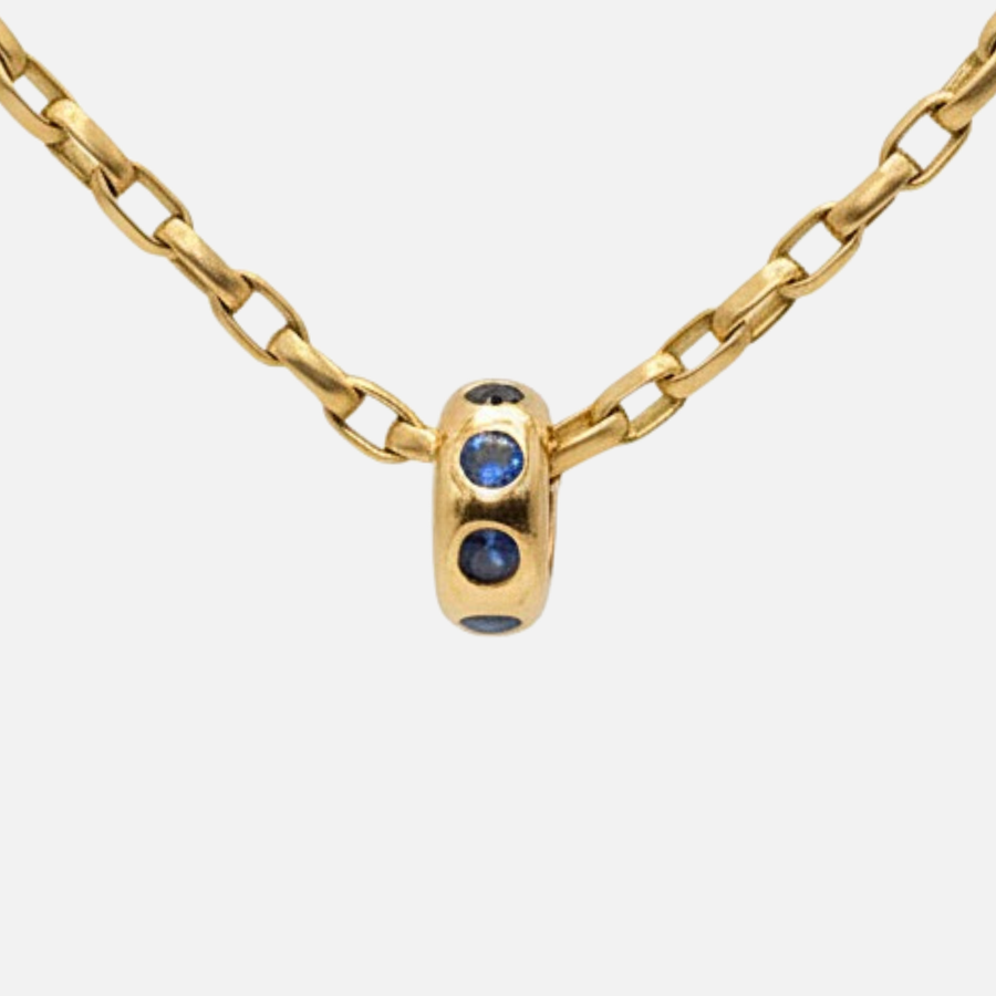 Add a touch of elegance to your chains with the Sonoma Rondelle Blue Sapphire Pendant. Handcrafted in 20K Peach Gold, this pendant features blue sapphires that catches the light at every angle. Elevate your pendant stack with this sophisticated piece.
