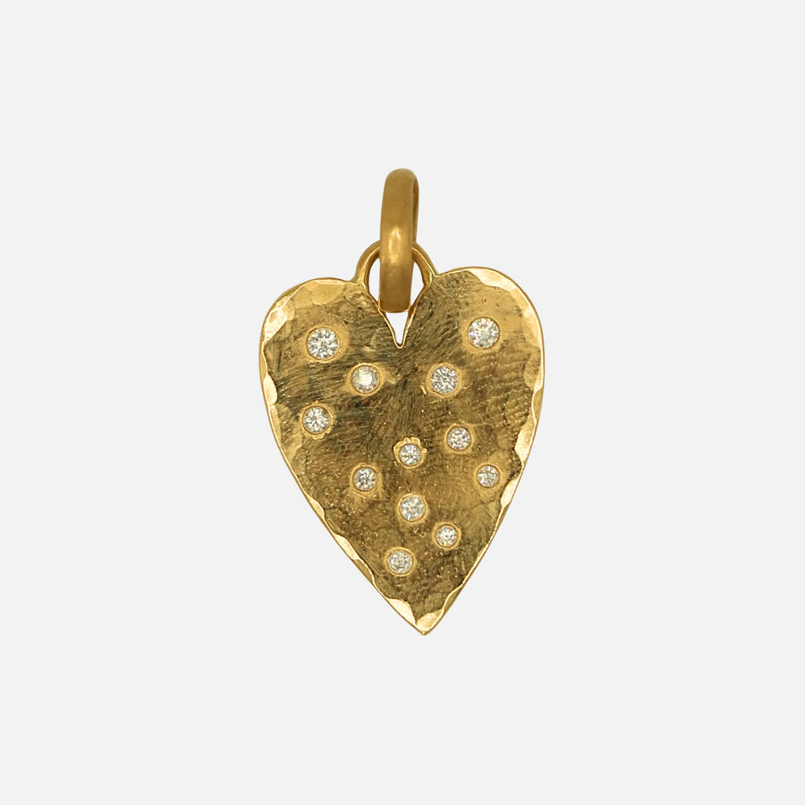Crafted with precision and elegance, the Sonoma Long Heart Pave Pendant in 20K Peach Gold is stunning. The delicate hammered heart design is adorned sparkling diamonds, creating a captivating and unique piece. Made with high-karat 20K peach gold, this pendant is luxury.