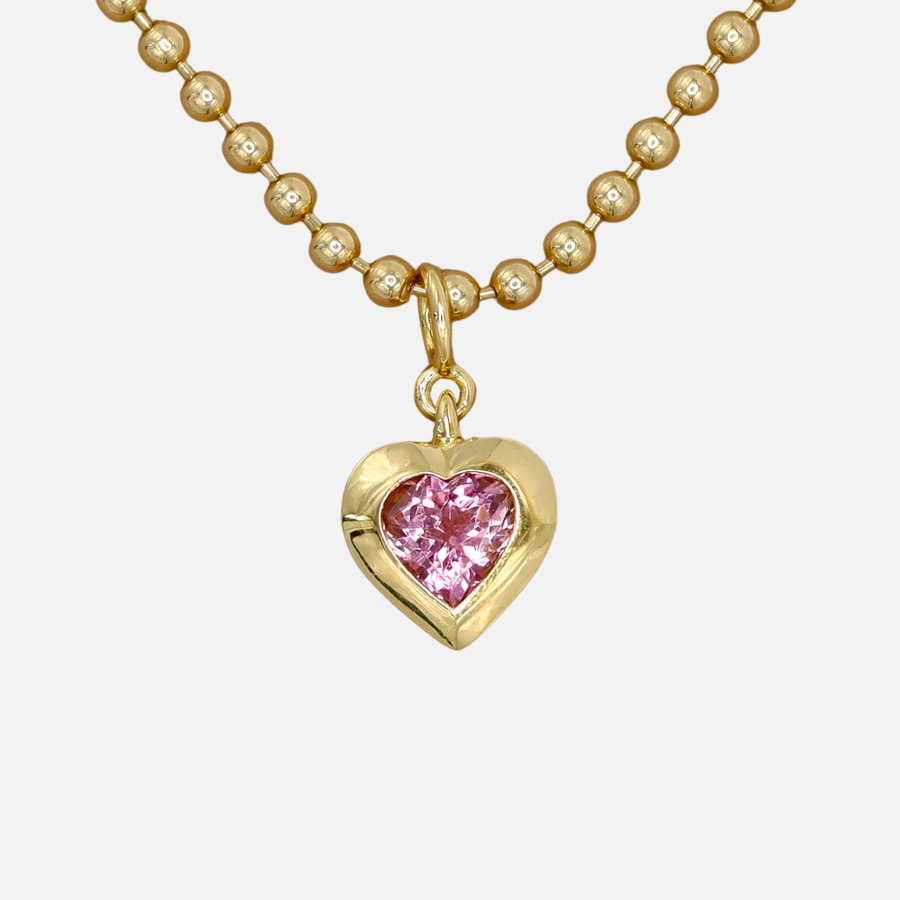 Duomo Pink Tourmaline Heart Pendant in 18K Yellow Gold A refined heart pendant featuring a luminous pink tourmaline set in 18K yellow gold. The Duomo collection celebrates romantic geometry with precision craftsmanship, pairing the stone's warm rose hue against the richness of solid gold. An understated yet distinctive piece designed for layering or worn as a singular statement. Perfect for marking meaningful moments or adding depth to an everyday collection.