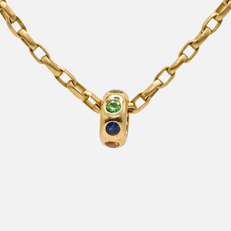 Add a touch of elegance to your chains with the Sonoma Rondelle Multi Colored Sapphire Pendant. Handcrafted in 20K Peach Gold, this pendant features multi-colored sapphires that catches the light at every angle. Elevate your pendant stack with this sophisticated piece.