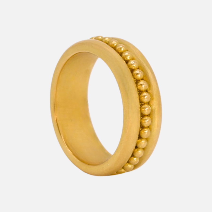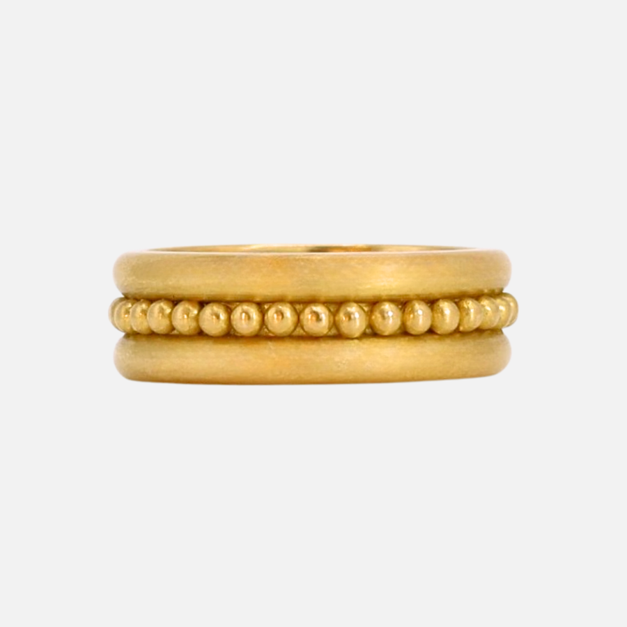 The Half Round "Margaret" is round on the outside and flat on the inside, a traditional design that has become a signature style for Reinstein Ross. Organic yet beautifully balanced, this double-stacked version punctuated with a channel of granules is stunning on its own or stacked with other rings.