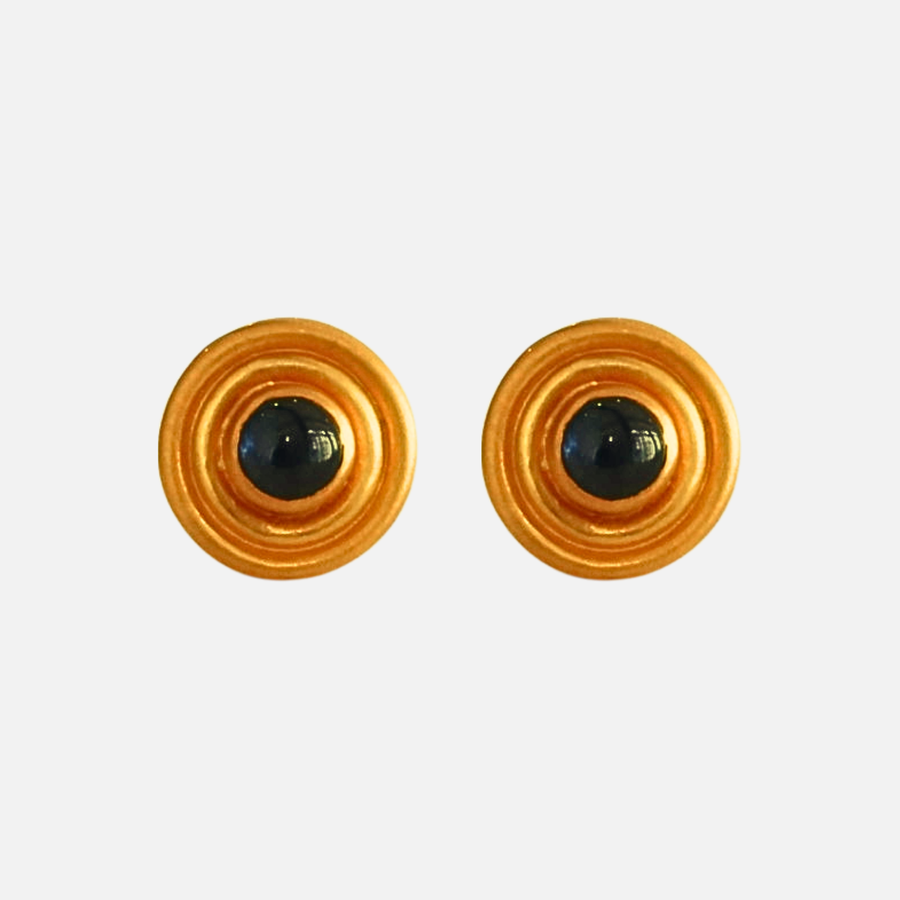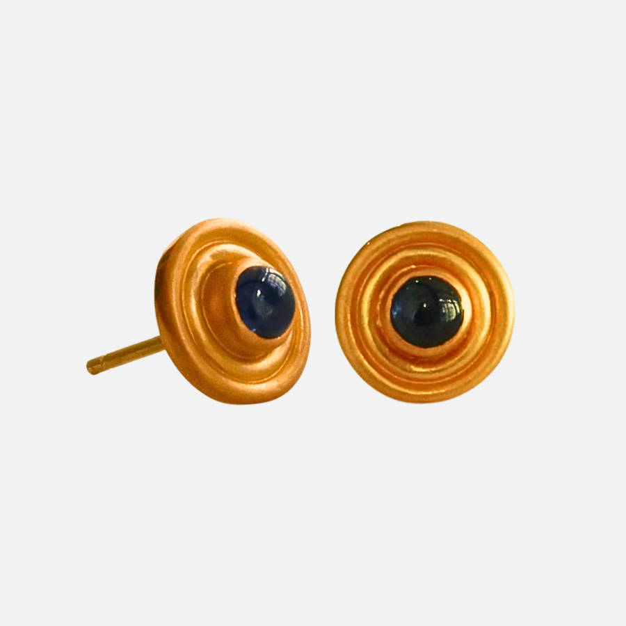These Sedona Disk Cabochon Blue Sapphire Studs feature a refined 4mm design set in luxurious 20K peach gold. The two-row disk setting enhances the deep blue sapphire’s natural brilliance, offering a sophisticated and timeless accessory. Perfect for those seeking expert craftsmanship and elegant style in a subtle yet striking stud earring.
