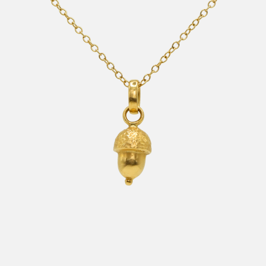 The Oak Leaf Collection Acorn is inspired by its namesake, a symbol of strength and courage. This delicate pendant features a tiny golden hammered acorn.